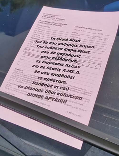 «Τη φορά αυτή δεν θα σου κόψουμε κλήση. Την επόμενη φορά όμως που θα παρκάρεις στον πεζόδρομο, σε διαβάσεις πεζών, και σε θέσεις Α.ΜΕ.Α, θα σου επιβληθεί το πρόστιμο. Βοήθησε και εσύ να ζήσουμε όλοι καλύτερα».