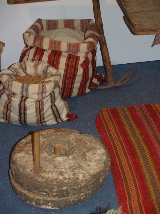 Κι στα ζώα έβαναν αλάτι, για να του φάν’, να δυναμώσουν τα κόκαλά τ’ς. Έφκιαναν πίτες μι πίτουρα απ’ του ψουμί όπους σήτιζαν για να κάνουν καθάριου ψουμί. Αλλά όταν είχαν ιργάτις δεν του σήτ’ζαν του ψουμί, το ‘φκιαναν όλο μι του πίτ’ρου. Έτρουγαν οι ιργάτις κάτι χουντρουψώμια…