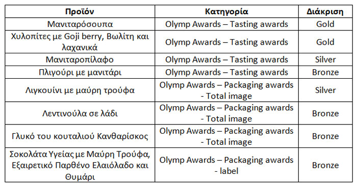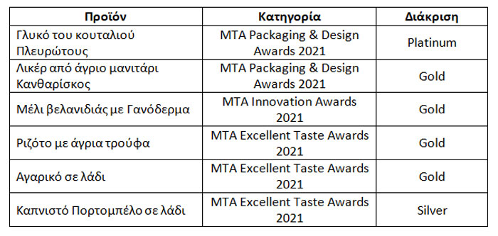 Ο πρώτος διαγωνισμός ήταν ο Mediterranean Taste Awards 2021 (MTA 2021), όπου συμμετείχε με έξι προϊόντα, τα οποία έλαβαν τις εξής διακρίσεις: