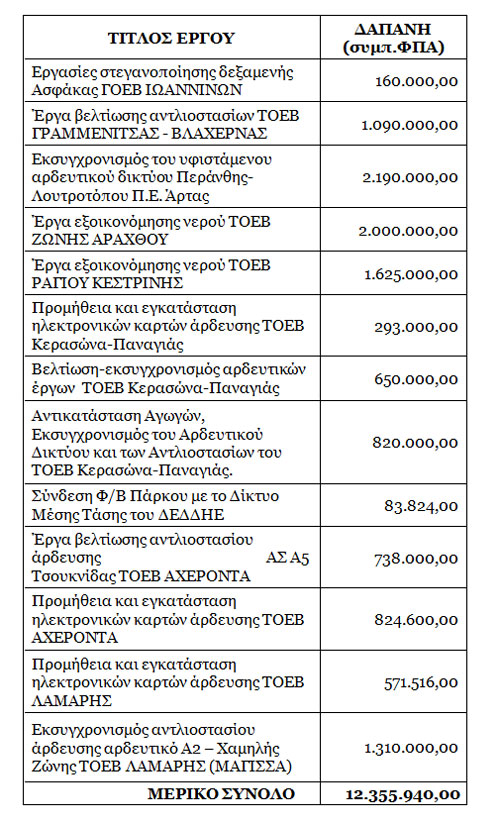 Ο Περιφερειάρχης ανακοίνωσε την υποβολή πρότασης ένταξης στο Πρόγραμμα Αγροτικής Ανάπτυξης 16 έργων βελτίωσης και εκσυγχρονισμού των αρδευτικών δικτύων ΓΟΕΒ-ΤΟΕΒ στις τέσσερις περιφερειακές ενότητες με συνολικό προϋπολογισμό 12.355 εκ. ευρώ. Η σχετική απόφαση λήφθηκε σήμερα από την Οικονομική Επιτροπή, με τον Περιφερειάρχη να τονίζει ότι η Περιφέρεια Ηπείρου είναι πρωτοπόρα σε όλη την Ελλάδα στην υποβολή προτάσεων στις προσκλήσεις που προκηρύσσονται. Η Περιφέρεια Ηπείρου- συνέχισε- έχει υποβάλλει και άλλες προτάσεις, θα υποβάλλει κι άλλες προσεχώς καθώς δόθηκε παράταση από το Υπουργείο Αγροτικής Ανάπτυξης.