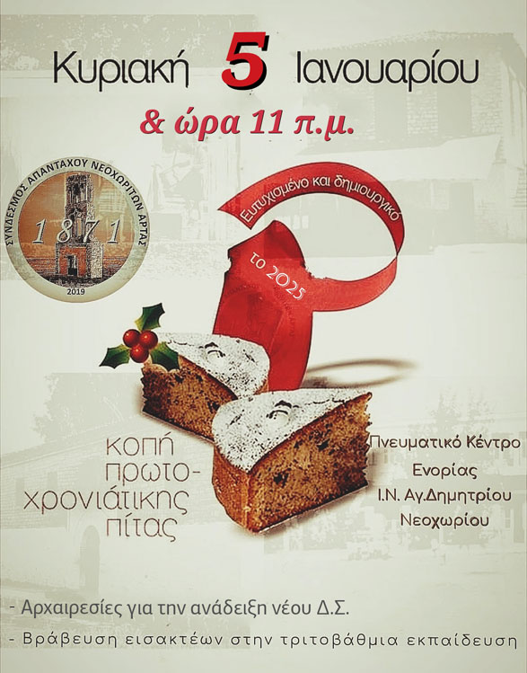 Το Δ.Σ. του Συνδέσμου των απανταχού Νεοχωριτών Άρτας (ΣΑΝΑ) ολοκλήρωσε τον Δεκέμβριο την θητεία του και αποφάσισε όπως προβλέπεται την προκήρυξη εκλογών για την Κυριακή 5 Ιανουαρίου 2025 προκειμένου να αναδειχθεί το νέο Διοικητικό Συμβούλιο. Παράλληλα θα πραγματοποιηθεί και η γενική συνέλευση του Συλλόγου.