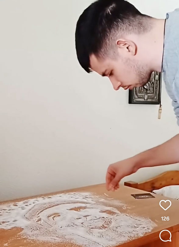 Η εικόνα του Χριστού σχεδιασμένη πάνω στο γυαλί, η εικόνα του προφήτη Ηλία επίσης χαραγμένη πάνω σε γυαλί με μοναδικό τρόπο αλλά και η απεικόνιση του αγίου Παϊσίου με κόκκους αλατιού είναι μερικά από τα έργα ενός χαρισματικού 23χρονου νεαρού με καταγωγή από την Λάρισα όπου μένει και εργάζεται πλέον στην Αθήνα.