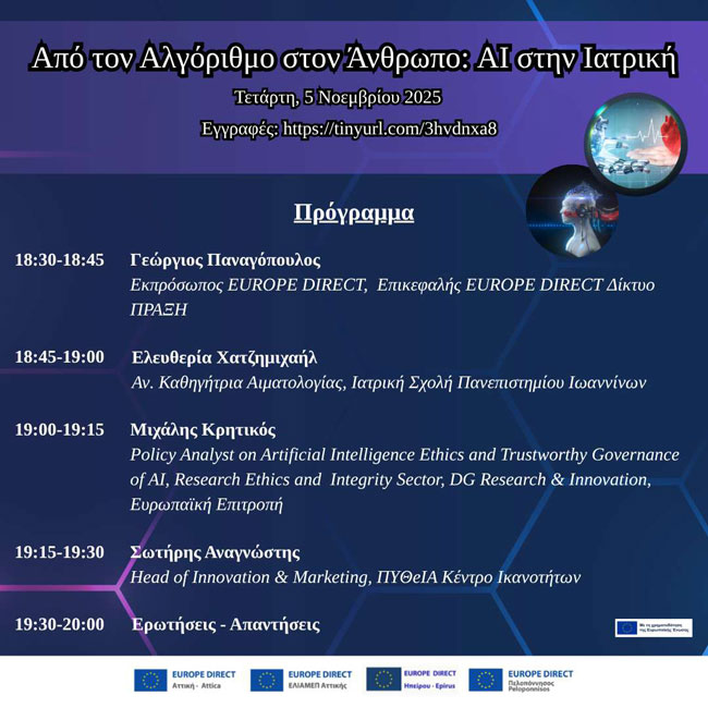 Tα EUROPE DIRECT ΕΛΙΑΜΕΠ Αττικής, Δικτύου ΠΡΑΞΗ, Ηπείρου & Πελοποννήσου διοργανώνουν διαδικτυακή εκδήλωση με τίτλο «Από τον Αλγόριθμο στον Άνθρωπο: AI στην Ιατρική», η οποία πρόκειται να πραγματοποιηθεί την Τετάρτη 5 Νοεμβρίου 2025 και ώρα 18:30.