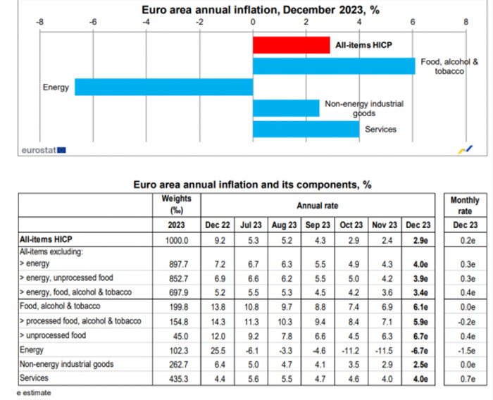 Στην Ευρωζώνη, τη μεγαλύτερη αύξηση σημείωσαν οι τιμές των τροφίμων, αλκοόλ και καπνού (6,1% έναντι 6,9% τον Νοέμβριο), ενώ οι τιμές των υπηρεσιών αυξήθηκαν 4% (όσο και τον Νοέμβριο) και των μη ενεργειακών βιομηχανικών προϊόντων αυξήθηκαν 2,5% έναντι 2,9%. Οι τιμές της ενέργειας μειώθηκαν 6,7% έναντι μείωσης 11,5% τον Νοέμβριο.