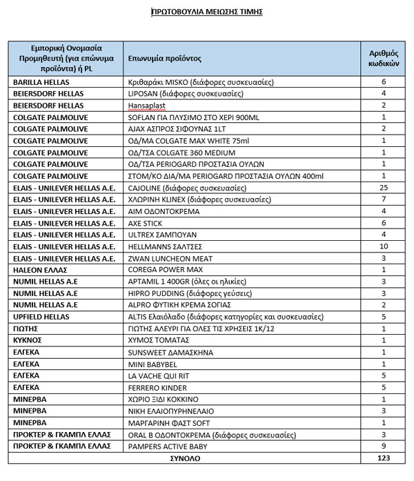 Η πρωτοβουλία μείωσης τιμής αφορά πρόσκληση της πολιτικής ηγεσίας του Υπουργείου Ανάπτυξης και Επενδύσεων κ. Τάκη Θεοδωρικάκου προς το σύνολο των προμηθευτών τροφίμων και επωνύμων καταναλωτικών προϊόντων καθώς και του οργανωμένου λιανεμπορίου (σούπερ μάρκετ) της χώρας. Μάλιστα, το υπουργείο Ανάπτυξης έδωσε στη δημοσιότητα τους πρώτους 123 κωδικούς, οι οποίοι μετέχουν στη μείωση τιμών, από 6% έως 15%.