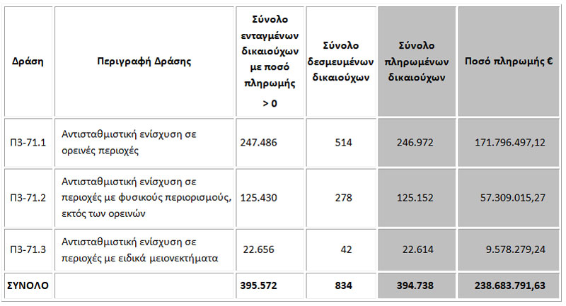 Μετά: α) την εφαρμογή των κριτηρίων επιλεξιμότητας για ένταξη, β) την Απόφαση Ένταξης Πράξεων στην Παρέμβαση Π3-71, γ) την ανάρτηση του πίνακα εγκεκριμένων παραγωγών με βάση την πρώτη κατάταξη, δ) τη διενέργεια όλων των προβλεπόμενων κατά το εθνικό και κοινοτικό δίκαιο ελέγχων (π.χ. monitoring, ενεργός γεωργός, κ.λπ.), ε) την εφαρμογή των μειώσεων-κυρώσεων, που αναφέρονται τόσο στο εφαρμοζόμενο ΣΣ ΚΑΠ, όσο και στη σχετική υπουργική απόφαση και στ) τη συστημική ανάκτηση πολυετών κυρώσεων, το τελικό ποσό πληρωμής προ συμψηφισμών ανά Δράση, έχει ως εξής: