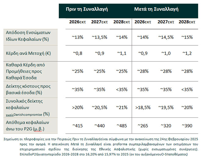 Με βάση τα παραπάνω, και συμπεριλαμβανομένης της υπόθεσης για ετήσια διανομή50% από τα κέρδη του 2025 και εφεξής, η proforma συνολική κεφαλαιακή θέση της Πειραιώς εκτιμάται σε περίπου 18,5% για το 2025, ενώ αναμένεται να φθάσει περίπου σε επίπεδο 19,5% έως το 2027 και περίπου 20% έως το 2028. Η επίπτωση αυτή μεταφράζεται σε δείκτη κεφαλαιακής επάρκειας με ασφαλές απόθεμα έναντι της σύστασης Πυλώνα 2 περίπου 250 μονάδων βάσης το 2025, το οποίο αναμένεται να ξεπεράσει τις 300 μονάδες βάσης ως το 2027 και να προσεγγίσει τις 400 μονάδες βάσης ως το 2028. Καθ' όλη τη διάρκεια της περιόδου, ο δείκτης CET1 της Πειραιώς αναμένεται να διατηρηθεί σε επίπεδο 13% και πάνω.