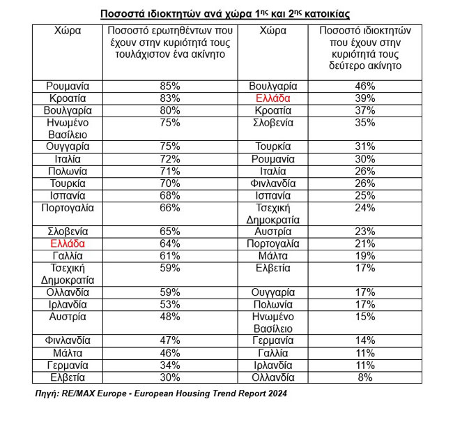 Σημαντικό ρόλο στον τομέα των ακινήτων της Ευρώπης θα συνεχίσει να διαδραματίζει τα επόμενα χρόνια η αγορά δεύτερης κατοικίας, καθώς, σύμφωνα με την ίδια έρευνα, η φιλοδοξία για την πραγματοποίηση αυτού του ονείρου παραμένει ισχυρή για πολλούς Ευρωπαίους. Αναλυτικότερα, το 69% των Ευρωπαίων είναι ιδιοκτήτες της κατοικίας στην οποία διαμένουν, ενώ 25% αυτών έχουν στην κυριότητά τους και μία δεύτερη κατοικία, η οποία κατά κύριο λόγο χρησιμοποιείται για διακοπές ή για τη συνταξιοδότηση.