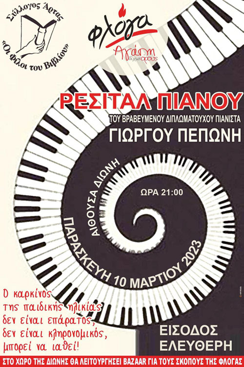 Την Παρασκευή 10 Μαρτίου 2023 και ώρα 21:00, ο Σύλλογος «Οι Φίλοι του Βιβλίου» Άρτας διοργανώνει «Ρεσιτάλ Πιάνου» του βραβευμένου διπλωματούχου πιανίστα Γιώργου Πεπώνη στην Αίθουσα «Διώνη» με είσοδο ελεύθερη.