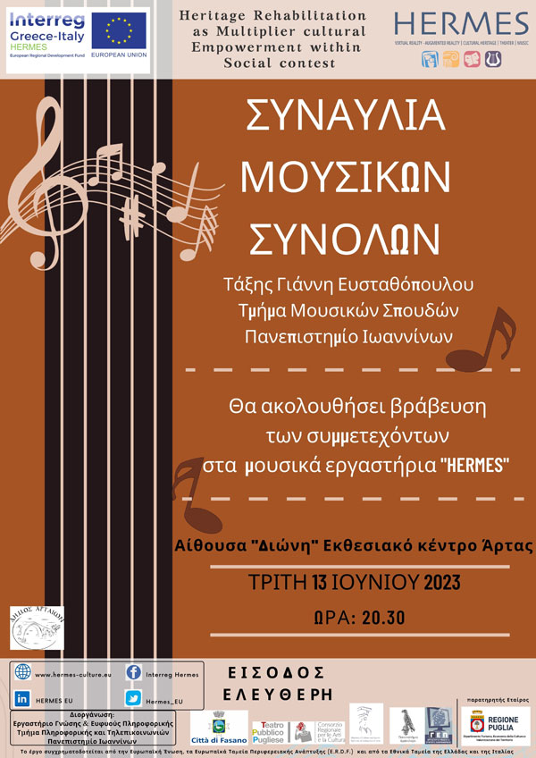 Την Τρίτη 13 Ιουνίου 2023 θα πραγματοποιηθεί η “Απολογιστική Μουσική Εκδήλωση »στο πλαίσιο υλοποίησης του έργου “HERMES” - «Η αποκατάσταση της Πολιτιστικής Κληρονομιάς ως πολλαπλασιαστικός παράγοντας για την πολιτιστική ενδυνάμωση του κοινωνικού πλαισίου» (www.hermes-culture.eu) το οποίο χρηματοδοτείται από το Διασυνοριακό Πρόγραμμα «INTERREG Ελλάδα-Ιταλία 2014-2020», με τη συγχρηματοδότηση της Ευρωπαϊκής Ένωσης και της Ελλάδας.