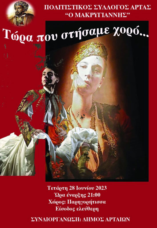 Τα χορευτικά τμήματα του Πολιτιστικού Συλλόγου Άρτας «Ο Μακρυγιάννης», θα πραγματοποιήσουν την ετήσια εκδήλωσή τους, στον επιβλητικά πανέμορφο αύλειο χώρο της Εκκλησίας της Παρηγορήτισσας στις 28/06/2023 στις 9.00 το βράδυ.