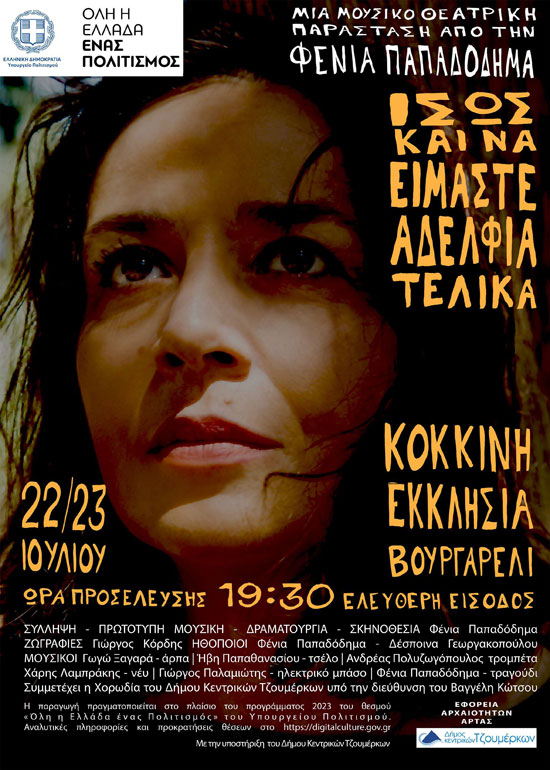 Η νέα μουσικοθεατρική παράσταση «Ίσως και να είμαστε αδέλφια τελικά», σε πρωτότυπη μουσική σύνθεση της Φένιας Παπαδόδημα, έρχεται στο Γενέσιο της Θεοτόκου (Κόκκινη Εκκλησιά) στο Βουργαρέλι Άρτας, στο αρχαιότερο Βυζαντινό μνημείο της Ηπείρου, για δύο μοναδικές παραστάσεις το Σάββατο 22 και την Κυριακή 23 Ιουλίου 2023, στις 20.00. Η παραγωγή πραγματοποιείται στο πλαίσιο του προγράμματος 2023 του θεσμού «Όλη η Ελλάδα ένας Πολιτισμός» του Υπουργείου Πολιτισμού και προσφέρεται δωρεάν για το κοινό. Συμμετέχει η χορωδία του Δήμου Κεντρικών Τζουμέρκων υπό τη διεύθυνση του Βαγγέλη Κώτσου.
