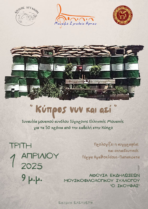 Το Μουσικό Σχολείο Άρτας με τη συνεργασία του Μουσικοφιλολογικού Συλλόγου Άρτης «Ο Σκουφάς» και τη στήριξη του Δήμου Αρταίων, διοργανώνει συναυλία – αφιέρωμα, στα 50 χρόνια από την τουρκική εισβολή στην Κύπρο, την Τρίτη 01 Απριλίου 2025 και ώρα 9 μ.μ. στην αίθουσα «Σκουφάς».