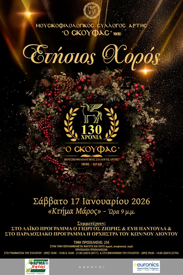 Ο Μουσικοφιλολογικός Σύλλογος Άρτης «Ο Σκουφάς» διοργανώνει τον ετήσιο χορό του το Σάββατο 17 Ιανουαρίου 2026, στο κτήμα «Μάρος». Η εκδήλωση αναμένεται να προσφέρει μια όμορφη βραδιά με ζωντανή μουσική και πολύ χορό.