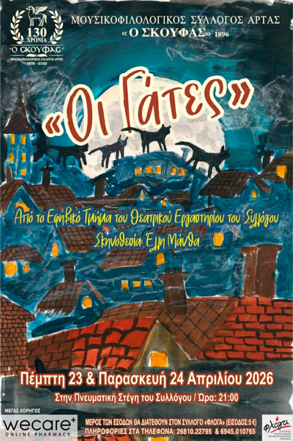 Το Θεατρικό Εργαστήρι του Μ/Φ Συλλόγου «Ο Σκουφάς» παρουσιάζει τη νέα παράσταση του εφηβικού του τμήματος με τίτλο «Οι Γάτες». Σε ένα ήσυχο νησί, όλα αλλάζουν όταν αρχίζουν να καραδοκούν οι προκαταλήψεις και τα συμφέροντα.