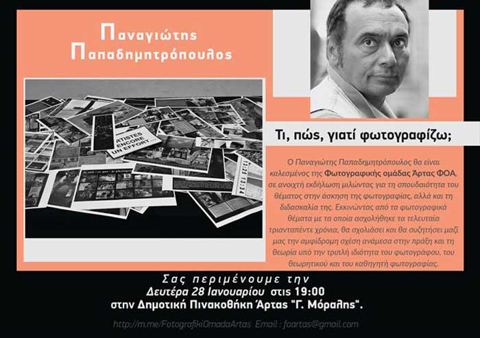 Ο Παναγιώτης Παπαδημητρόπουλος θα είναι καλεσμένος της Φωτογραφικής ομάδας Άρτας ΦΟΑ, σε ανοιχτή εκδήλωση μιλώντας για τη σπουδαιότητα του θέματος στην άσκηση της φωτογραφίας, αλλά και τη διδασκαλία της. Η εκδήλωση που είναι ανοιχτή για όλους, γίνεται από τη ΦΟΑ τη Δευτέρα 28 Ιανουαρίου στη Δημοτική Πινακοθήκη Άρτας "Γιάννης Μόραλης" στις 7 το απόγευμα.