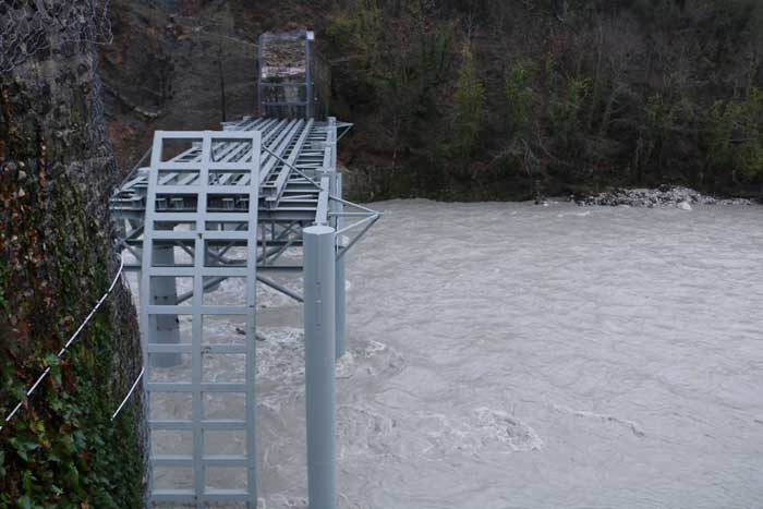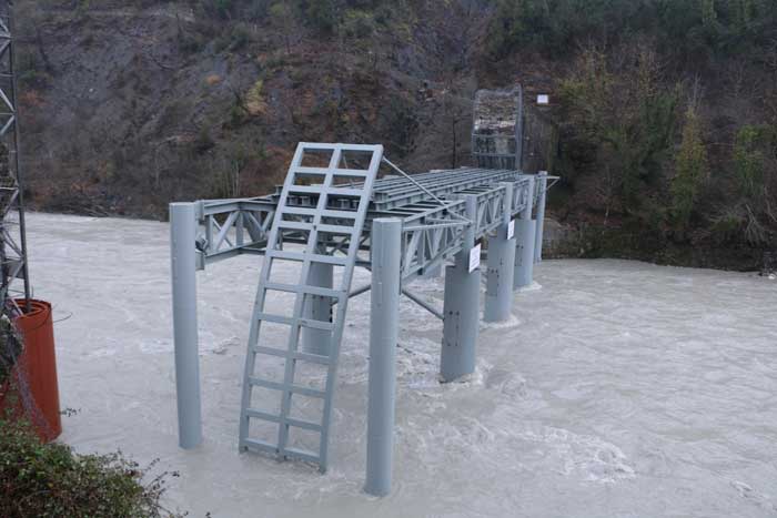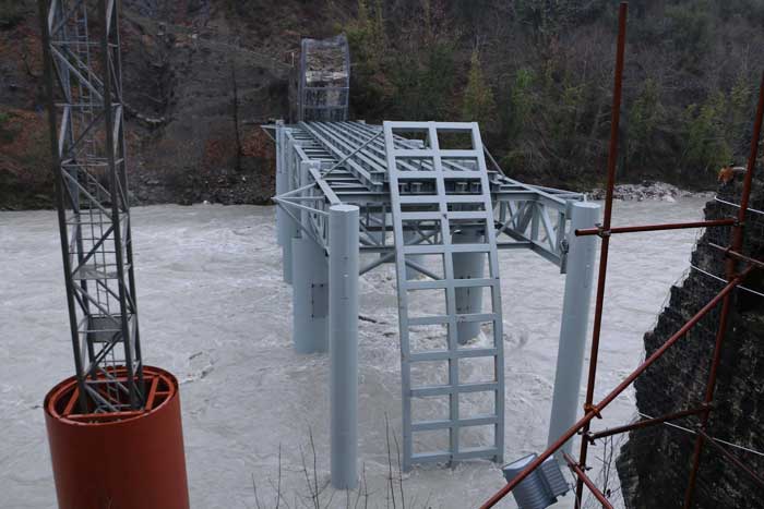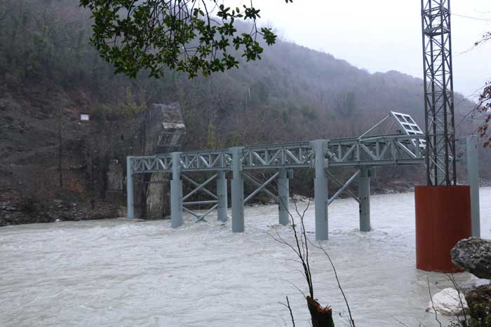 Όπως φαίνεται και στις σχετικές φωτογραφίες, η μεταλλική βάση που θα παρέχει το πρώτο δάπεδο εργασίας και την ασφαλή διέλευση του ποταμού έχει ήδη τοποθετηθεί στη θέση της. Η μεταλλική βάση έχει θεμελιωθεί ισχυρά μέσα στο ποτάμι και έχει ανυψωθεί σε κατάλληλο ύψος ώστε να επιτρέπονται εργασίες στο ποτάμι και εντός της χειμερινής περιόδου.