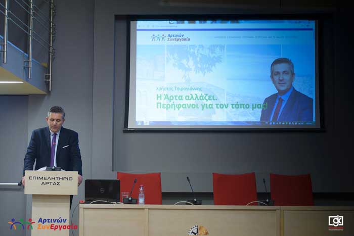 Ο δήμαρχος Αρταίων τόνισε κατά την ομιλία του τα εξής «Σήμερα παρουσιάζουμε ένα προεκλογικό πρόγραμμα που αποτελεί για εμάς μια δέσμευση- ένα συμβόλαιο που κάνουμε με τους συμπολίτες της Άρτας. Ένα συμβόλαιο τιμής και εμπιστοσύνης που μας δένει όλους μας, όλα τα μέλη του συνδυασμού μας και το οποίο, όπως αποδείξαμε και το 2014, στις τότε προγραμματικές μας θέσεις, το τηρήσαμε στο ακέραιο. Όλοι μαζί, ως μια ομάδα συνεχίζουμε και θα συνεχίσουμε μέχρι το τέλος. Χωρίς δεύτερες σκέψεις, χωρίς «κρυφές» στρατηγικές. Στρατηγικές που έχουν στόχο την καρέκλα και το προσωπικό συμφέρον…