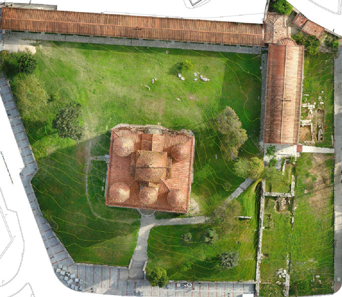 Η αρχιτεκτονική μελέτη αφορά στη βελτίωση του μνημείου όσον αφορά στην αρχική φέρουσα ικανότητά του. Συνοπτικά, στο ισόγειο, προβλέπεται να καθαιρεθούν τα επιχρίσματα που παραμένουν στο εσωτερικό του περιστώου. Το δάπεδο αποκαθίσταται στην ίδια μορφή, μετά τις απαιτούμενες στατικές παρεμβάσεις. Καθαιρείται η μεταλλική σκάλα πρόσβασης στον όροφο και κατασκευάζεται νέα στην ίδια θέση. Στον κυρίως Ναό, στις εξωτερικές επιφάνειες, προβλέπεται σημειακά η αποκατάσταση των φθαρμένων και ευτελών αρμολογημάτων, ώστε να μην παραμορφώνονται τα δομικά στοιχεία του μνημείου. Εσωτερικά προβλέπονται τοπικές ενισχύσεις κιονόκρανων και κιόνων που έχουν αστοχήσει. Από τις στέγες καθαιρούνται οι επικαλύψεις με κεραμίδια των πέντε τρούλων και των κεραιών της σταυρικής κάλυψης, όπως και του βάθρου του τυμπάνου του κεντρικού τρούλου.