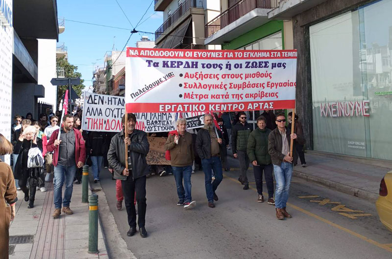 Η συγκέντρωση πραγματοποιήθηκε στην κατάληψη της ομοσπονδίας των αγροτών μπροστά από το κτήριο της ΠΕ Άρτας. Τους απεργούς καλωσόρισε ο Μπέτσας Βαγγέλης, πρόεδρος της Ομοσπονδίας Αγροτικών Συλλόγων Ν. Άρτας. Χαιρετισμό απηύθυναν η Μάντζιου Κωνσταντίνα, από το ΦΣ Γεωπονίας, η Πριοβόλου Αντιγόνη από το ΝΤ ΑΔΕΔΥ της Άρτας, ο Ρίζος Βασίλης από το ΔΣ της ΟΑΣΝΑ, ο Ψύλλιας Χριστόφορος Πρόεδρος της ΕΛΜΕ Άρτας και η Μαίρη Καραμπίκα πρόεδρος του συλλόγου γυναικών Άρτας της ΟΓΕ. Ξεχωριστή θέση στους χαιρετισμούς είχαν οι απολυμένες τραπεζοκόμες του ΓΝ Άρτας. Η κεντρική ομιλία πραγματοποιήθηκε από τον Γιάννη Γάλλιο πρόεδρο του Εργατικού Κέντρου Άρτας.
