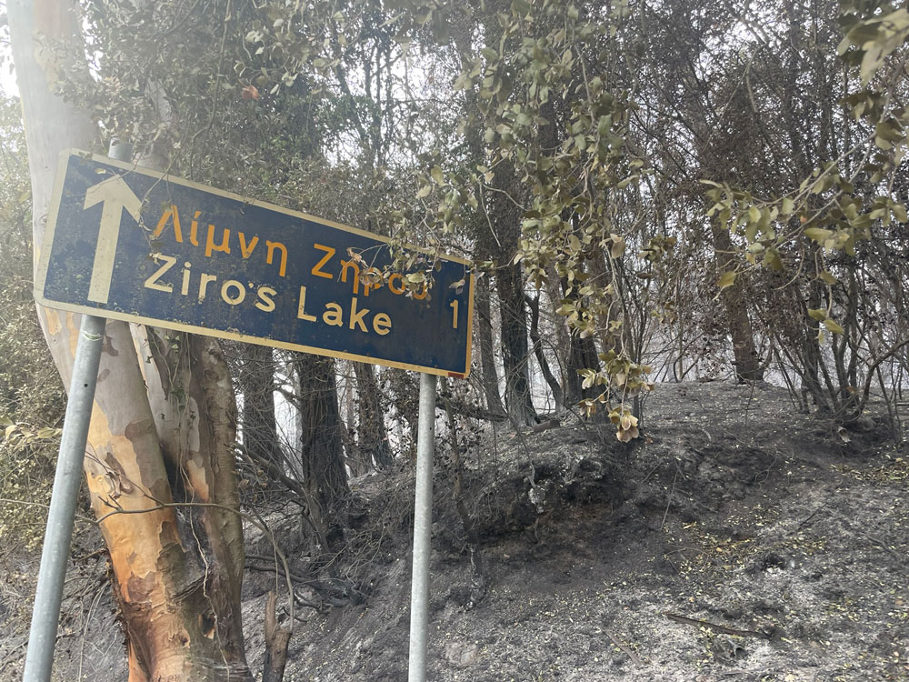 Προχωρώντας προς το εσωτερικό, η εικόνα παραμένει σχεδόν ανέπαφη. Φτάνοντας στην καφετέρια με θέα τη Λίμνη, γίνεται όμως εμφανές ότι η φωτιά άγγιξε την απέναντι πλευρά, στην περιοχή ανάμεσα στη Φιλιππιάδα και τη Λίμνη Ζηρού, εκεί που βρίσκεται η Παιδούπολη Ζηρού. Σ’ αυτό το σημείο τα καμένα ξεχωρίζουν, με το μαύρο να σπάει απότομα το πράσινο της φύσης.