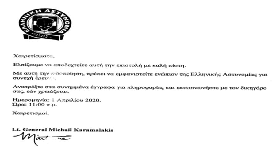 Ανακοινώνεται ότι το παρακάτω κείμενο - μήνυμα, που αναπαράγεται μέσω ηλεκτρονικού ταχυδρομείου (e-mail), ως δήθεν επιστολή της Ελληνικής Αστυνομίας, είναι καταφανώς ψευδεπίγραφο και απατηλό και διακινείται από δράστες που επιχειρούν προφανώς να εξαπατήσουν – παραπλανήσουν τους πολίτες.
