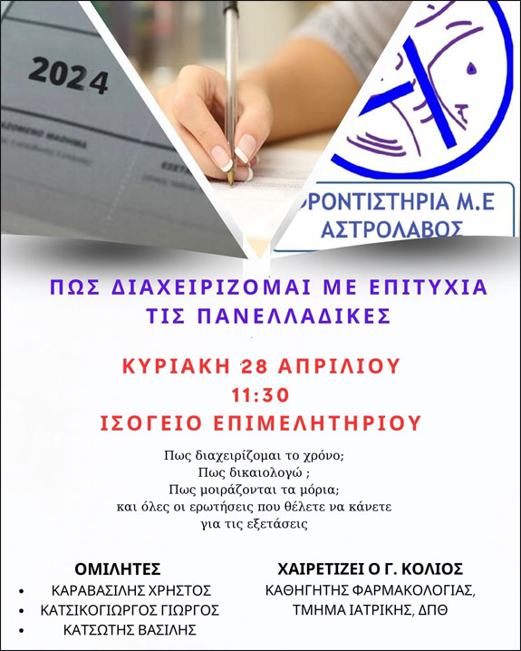 Το Φροντιστήριο Μέσης Εκπαίδευσης Αστρολάβος διοργανώνει ημερίδα με θέμα «Πως διαχειρίζομαι με επιτυχία τις Πανελλαδικές εξετάσεις», την Κυριακή 28 Απριλίου στις 11.30 π.μ. στο Επιμελητήριο Άρτας. Στην ημερίδα θα πραγματοποιήσει χαιρετισμό, ο Ομότιμος καθηγητής Φαρμακολογίας, της Ιατρικής Σχολής του Δημοκρίτειου Πανεπιστημίου Θράκης, κ. Γεώργιος Κολιός, που διαθέτει πολυετή εμπειρία στην διδασκαλία, στην βαθμίδα της Τριτοβάθμιας Εκπαίδευσης. Το σχετικό Δελτίο Τύπου το οποίο υπογράφει ο Βασίλης Κατσώτης (χημικός), αναφέρει: