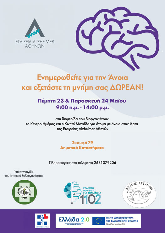 Στο πλαίσιο της ευαισθητοποίησης της κοινότητας, της πρόληψης και της έγκαιρης διάγνωσης της άνοιας, Το Κέντρο Ημέρας και η Κινητή Μονάδα για άτομα με άνοια στην Άρτα της Εταιρείας Alzheimer Αθηνών, υπηρεσίες χρηματοδοτούμενες από το Ταμείο Ανάκαμψης και Ανθεκτικότητας με την εποπτεία του υπουργείου υγείας, υπό την αιγίδα του Ιατρικού Συλλόγου Άρτας και σε συνεργασία με το Δήμο Αρταίων, διοργανώνουν διημερίδα ενημέρωσης του κοινού για την άνοια και δωρεάν εξέτασης μνήμης την Πέμπτη 23 Μαΐου (ώρα 9.00 - 14.00) και Παρασκευή 24 Μαΐου 2024 (ώρα 9.00 - 14.00) στα Δημοτικά Καταστήματα Άρτας (Σκουφά 79).