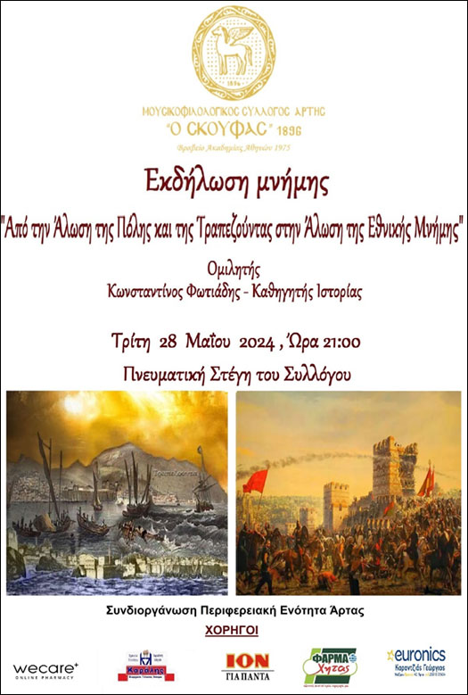 Ο καθηγητής ιστορίας Κωνσταντίνος Φωτιάδης θα δώσει ομιλία στην Πνευματική Στέγη του Συλλόγου «Σκουφάς» με θέμα «Από την Άλωση της Κωνσταντινούπολης και της Τραπεζούντας στην Άλωση της Εθνικής Μνήμης», αύριο Τρίτη (28/5) στις 9:00 μ.μ.