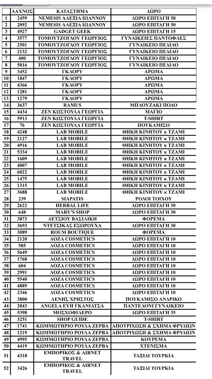 Μετά την ηλεκτρονική κλήρωση που έγινε ζωντανά χθες στον Art tv οι λαχνοί που αντιστοιχούν στα δώρα της Εκπτωτικής Νύχτας είναι οι παρακάτω.