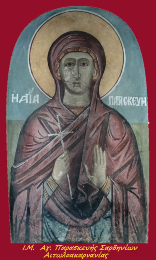 Λίγα μόλις χιλιόμετρα μετά την Αμφιλοχία και ακριβώς λίγο βορειότερα του δρόμου που ενώνει τα Σαρδίνια με την Βαρετάδα βρίσκεται η Ιερά Μονή της Αγίας Παρασκευής Σαρδινίων. Το καθολικό είναι κτίσμα του 17ου αιώνος και είναι σταυροειδούς μορφής με οκτάπλευρο τρούλλο, που σε κάθε του πλευρά ανοίγεται από ένα μονόλοβο τοξωτό παράθυρο. Η σκεπή του καθολικού είναι πέτρινη ενώ ο ναός εσωτερικά κοσμείται με τοιχογραφίες με πλούσια θεματολογία από την Παλαιά αλλά και την Καινή Διαθήκη. Ξεχωρίζουν οι τοιχογραφίες που είναι περιμετρικά του κυρίως ναού εσωτερικά και αναπαριστούν κάθε στάδιο από τις στάσεις των χαιρετισμών. Εξαίχουσα θέση έχει και η τοιχογραφία του Αγίου Βαρβάρου, τοπικού μεγάλου και θαυματουργού Αγίου της Αιτωλοακαρνανίας ενώ επίσης αξιοθαύμαστη είναι απεικόνιση του Αββά Σισσώη μπροστά στον τάφο του Μεγ. Αλεξάνδρου. Στο Ιερό Βήμα σε σαγηνεύει η μορφή του Αγίου Σπυρίδωνος με το έντονο βλέμμα. Το τέμπλο της καθολικού είναι ξυλόγλυπτο με ιδιαίτερη λεπτομέρεια αν και χρήζει ανακαίνισης ένεκα της φθοράς του χρόνου. Το καθολικό της μονής έχει μια μικρή λιτή στα πρότυπα των βυζαντινών και μεταβυζαντινών ναών και καθολικών του Αγίου Όρους.