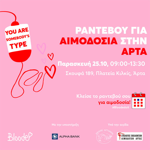 Η αιμοδοσία θα πραγματοποιηθεί με την υποστήριξη της Alpha Bank στο πλαίσιο του προγράμματος «Μαζί, με στόχο την υγεία», το οποίο θα ενισχύσει φέτος με ιατρικά μηχανήματα και ιατροφαρμακευτικό εξοπλισμό δομές υγείας και φροντίδας της Ηπείρου, με στόχο την ισότιμη πρόσβαση όλων στην Υγεία. Η σύμπραξή της Τράπεζας με το Bloodeγια τη διοργάνωση αιμοδοσιών σε πόλεις της Ηπείρου, με αφετηρία την Άρτα, στοχεύει στην ενίσχυση της αιμοδοτικής κουλτούρας και την αύξηση των μονάδων αίματος για την στήριξη του Εθνικού Συστήματος Υγείας.
