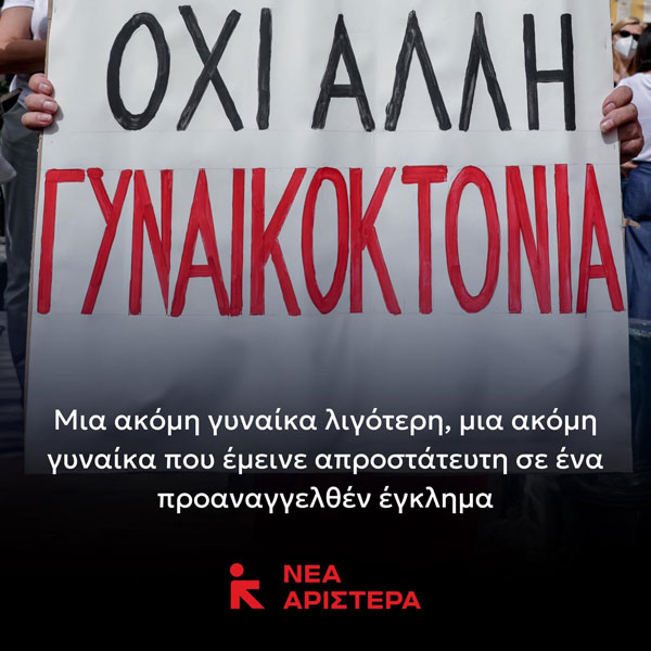Με αφορμή την πρόσφατη γυναικοκτονία στο Αγρίνιο, η Νέα Αριστερά Άρτας εξέδωσε την ακόλουθη ανακοίνωση: