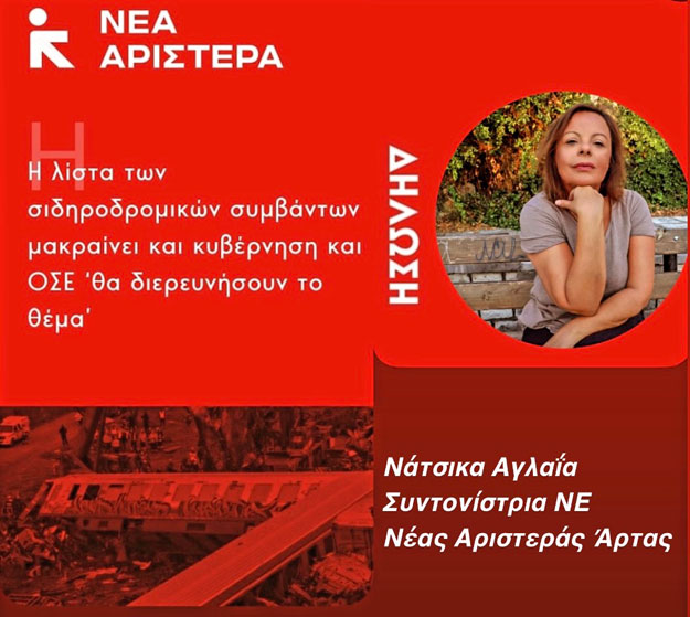 Την παρακάτω δήλωση έκανε η κα Αγλαΐα Νάτσικα, Καθηγήτρια Μουσικής και Συντονίστρια ΝΕ Νέας Αριστεράς Άρτας, σχετικά με το πρόσφατο περιστατικό στον προαστιακό και τα ζητήματα ασφάλειας στις σιδηροδρομικές επικοινωνίες: