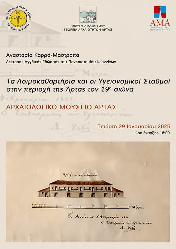 Ο Σύλλογος «Φίλοι Αρχαιολογικού Μουσείου και Μνημείων Άρτας» και η Εφορεία Αρχαιοτήτων Άρτας διοργανώνουν από κοινού εκδήλωση, η οποία θα πραγματοποιηθεί στο Αρχαιολογικό Μουσείο Άρτας, την Τετάρτη 29 Ιανουαρίου 2025 και ώρα 18:00.