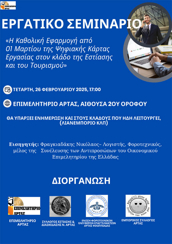 Το Επιμελητήριο Άρτας σας προσκαλεί σε εργασιακό σεμινάριο με θέμα: «Η Καθολική Εφαρμογή από 1ή Μαρτίου της Ψηφιακής Κάρτας Εργασίας στον Κλάδο της Εστίασης και του Τουρισμού».