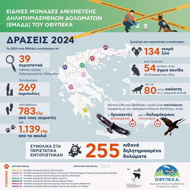 Η περσινή χρονιά είναι η δεύτερη κατά την οποία λειτούργησαν σε πλήρη επιχειρησιακή ετοιμότητα οι ΕΜΑΔΔ του ΟΦΥΠΕΚΑ, που έχουν ως στόχο τον εντοπισμό δηλητηριασμένων δολωμάτων στην ελληνική ύπαιθρο και την προστασία των ζώων που απειλούνται από τη χρήση τους.
