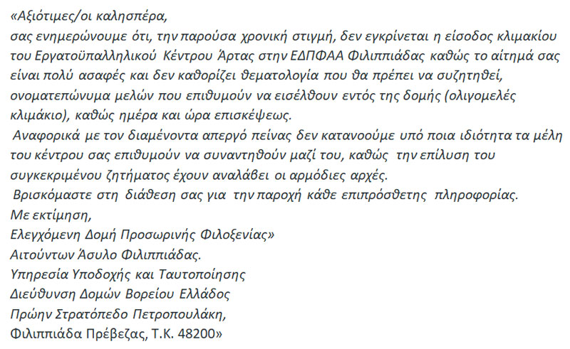 «Πρόσφατα, το Εργατικό Κέντρο Άρτας ζήτησε να συνομιλήσει με τους εργαζόμενους της ελεγχόμενης δομής προσωρινής φιλοξενίας αιτούντων άσυλο Φιλιππιάδας, με θέμα την απεργία της Πρωτομαγιάς. Μάλιστα, άφησε στη διακριτική ευχέρεια των διοικούντων να καθορίσουν οι ίδιοι την ημέρα που μπορούν, με μόνη παράκληση αν ήταν δυνατόν να είναι μετά τις δύο το μεσημέρι, για να μπορέσει να σχολάσει από τη δουλειά του και να παραβρεθεί στη συνάντηση με τους εργαζόμενους, και ο πρόεδρος του Εργατικού Κέντρου. Ταυτόχρονα, ζητήσαμε ενημέρωση από τους διοικούντες για την κατάσταση του απεργού πείνας που ζητάει πολιτικό άσυλο.