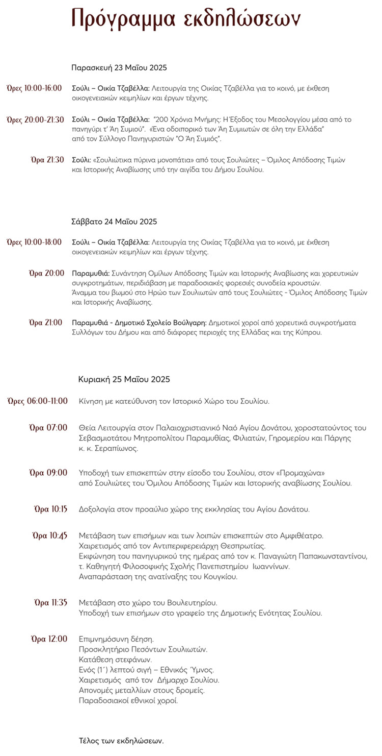 Οι εορταστικές εκδηλώσεις μνήμης για το Ολοκαύτωμα του Σουλίου και την αυτοθυσία του καλόγερου Σαμουήλ και των Σουλιωτών υπέρ της Ελευθερίας θα πραγματοποιηθούν από την Παρασκευή 23 έως και την Κυριακή 25 Μαΐου 2025.