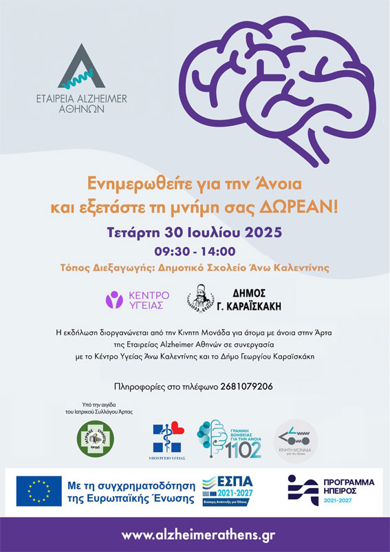 Η Κινητή Μονάδα για άτομα με άνοια της Εταιρείας Alzheimer Αθηνών, σε συνεργασία με τον Δήμο Γεωργίου Καραϊσκάκη και το Κέντρο Υγείας Άνω Καλεντίνης, θα βρίσκεται ξανά στην περιοχή την Τετάρτη 30 Ιουλίου, από τις 09:30 έως τις 14:00, στον χώρο του Δημοτικού Σχολείου Άνω Καλεντίνης.