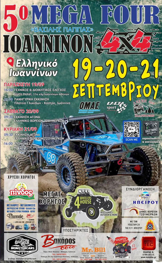 Με 28 δυνατές συμμετοχές θα διεξαχθεί το Σ/Κ 20-21/9 στην πίστα στο Ελληνικό Ιωαννίνων το 5ο Mega Four 4X4 Ioanninon "Βασίλης Παππάς". Ο αγώνας διοργανώνεται από την ΕΛ.ΕΤ.Α. και την Λέσχη 4Χ4 Ιωαννίνων με την υποστήριξη της Ο.Μ.Α.Ε.