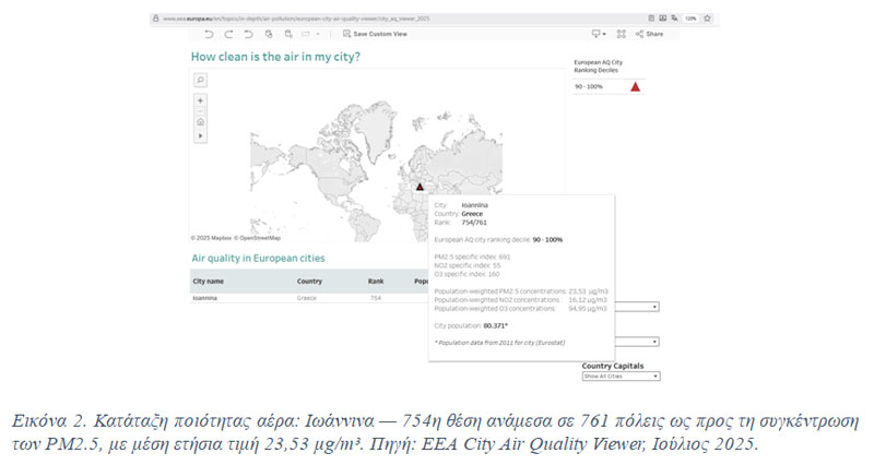 Τα πλέον πρόσφατα στοιχεία στοιχεία του EEA για την ποιότητα του αέρα στις ευρωπαϊκές πόλεις (έκδοση Ιούλιος 2025) αποκαλύπτουν μία ιδιαίτερα ανησυχητική εικόνα για τα Ιωάννινα: