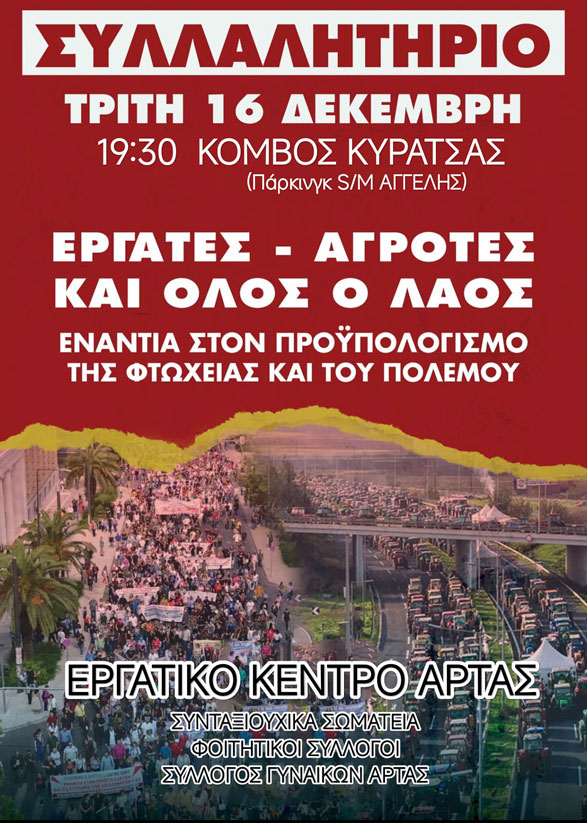 «Το Εργατικό Κέντρο Άρτας καλεί τα σωματεία μέλη του, τους εργαζόμενους της Άρτας σε συλλαλητήριο ενάντια στον κρατικό πολεμικό προϋπολογισμό για το 2026, την Τρίτη 16 Δεκέμβρη στις 19.30 στην Κυράτσα (πάρκινγκ S/M «Αγγέλης»). Καλούμε τους μαζικούς φορείς της πόλης, όπως τα σωματεία του Δημοσίου, τον Εμπορικό Σύλλογο, το Εμπορικό Επιμελητήριο, τους πολιτιστικούς συλλόγους, να πάρουν αποφάσεις συμμετοχής και στήριξης.