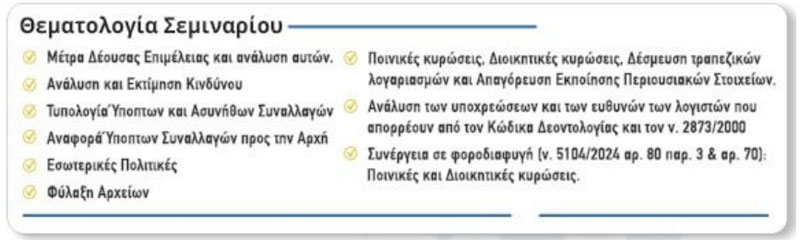 Η Ένωση Φοροτεχνικών Ελεύθερων Επαγγελματιών Άρτας – Φιλιππιάδας (ΕΦΕΕΑΦ), στο πλαίσιο του προγράμματος διαρκούς ενημέρωσης των μελών της, διοργανώνει ενημερωτικό σεμινάριο με θέμα: Δέουσα επιμέλεια – Οι λογιστές ως υπόχρεα πρόσωπα – Συνέργεια σε φοροδιαφυγή – Κώδικας δεοντολογίας.