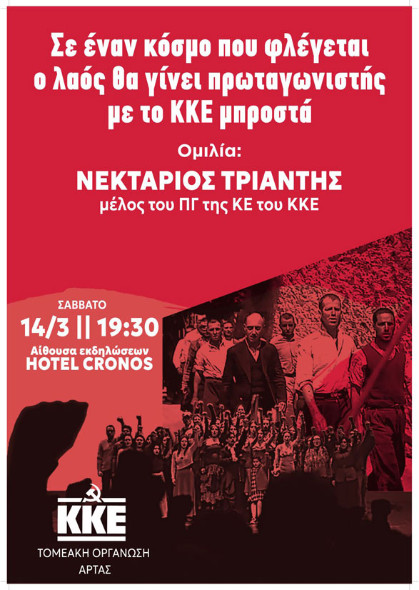 Η Τομεακή Οργάνωση Άρτας του ΚΚΕ θα πραγματοποιήσει το Σάββατο 14 Μαρτίου και ώρα 19:30 πολιτική συγκέντρωση-εκδήλωση με θέμα: «Σε έναν κόσμο που φλέγεται ο λαός θα γίνει πρωταγωνιστής με το ΚΚΕ μπροστά» στην αίθουσα εκδηλώσεων του ξενοδοχείου «Κρόνος».