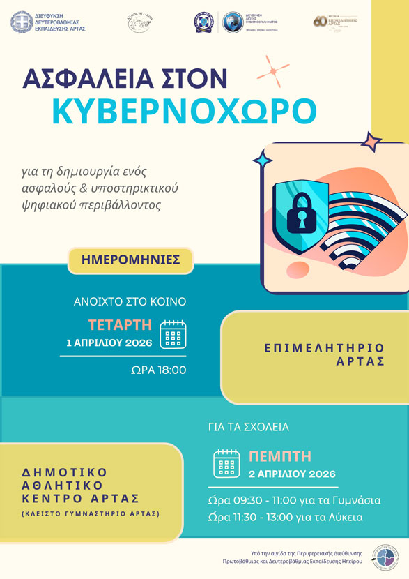 Η Διεύθυνση Δευτεροβάθμιας Εκπαίδευσης Άρτας, σε συνεργασία με το Επιμελητήριο Άρτας, τον Δήμο Αρταίων και την Ελληνική Αστυνομία, διοργανώνει ενημερωτική δράση με θέμα «Ασφάλεια στον Κυβερνοχώρο» και στόχο να ενισχύσει τη γνώση, την ευαισθητοποίηση και την ενεργοποίηση της εκπαιδευτικής και τοπικής κοινότητας στην πρόληψη και την αντιμετώπιση των κινδύνων που σχετίζονται με τις νέες τεχνολογίες.