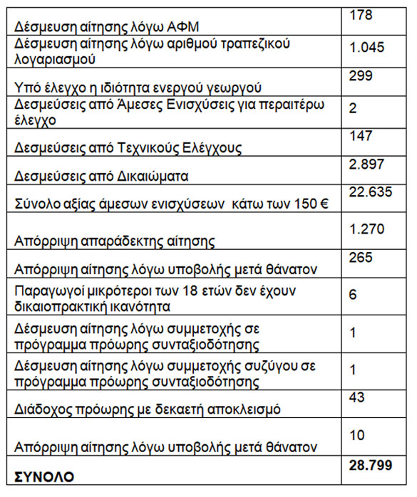 • Οι υπόλοιπες κατηγορίες, που αφορούν συνολικά σε 28.799 μοναδικά ΑΦΜ και που δε συμπεριλήφθηκαν και αυτά στην πληρωμή είναι: