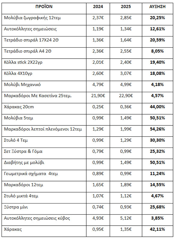 Ακολουθεί ο πίνακας με τις αυξήσεις των σχολικών ειδών: