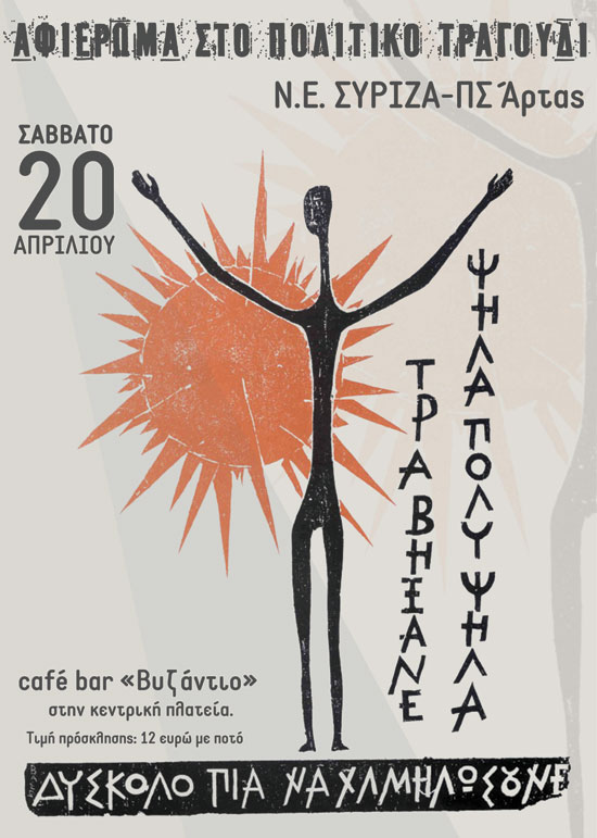 Το Σάββατο 20 Απριλίου 2024 και ώρα 10.00 μμ η ΝΕ ΣΥΡΙΖΑ-ΠΣ Άρτας σας προσκαλεί σε ένα αφιέρωμα στο πολιτικό τραγούδι, με την ορχήστρα του Παναγιώτη Καραδημήτρη, στο café bar «Βυζάντιο» στην κεντρική πλατεία.