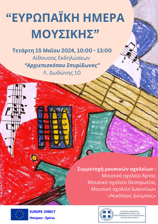 Το ΚΕΝΤΡΟ ΕΥΡΩΠΑΪΚΗΣ ΠΛΗΡΟΦΟΡΗΣΗΣ – EUROPEDIRECT – ΗΠΕΙΡΟΥ (europedirect.gr) και η Περιφερειακή Διεύθυνση Εκπαίδευση Ηπείρου (srv-ipeir.pde.sch.gr), προσκαλούν μαθητές, δασκάλους, γονείς, μουσικοπαιδαγωγούς, διευθυντές σχολείων, μουσικούς και φίλους να γιορτάσουν την Ευρωπαϊκή Ημέρα της Μουσικής, την Τετάρτη 15 Μαΐου 2024(*) το πρωί από τις 10:00 έως τις 13:00 στην αίθουσα Εκδηλώσεων “Αρχιεπισκόπου Σπυρίδωνος” Δωδώνης 10, με τη συμμετοχή και παρουσίαση τριών (3) μουσικών σχολείων της περιφέρειας Ηπείρου: Άρτας, Θεσπρωτίας, Ιωαννίνων “Νικόλαος Δούμπας”.